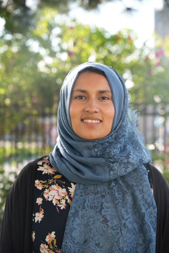 [Image description: A Muslim Bangladeshi-Canadian woman of color grins at the camera. She is wearing a blue hijab and a floral dress with a black cardigan. She is standing outside with a background of blurred green trees and a black fence.]